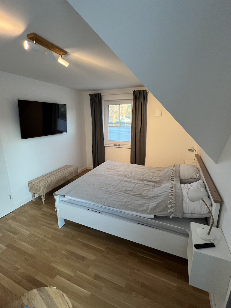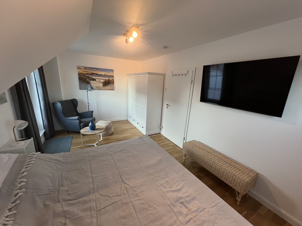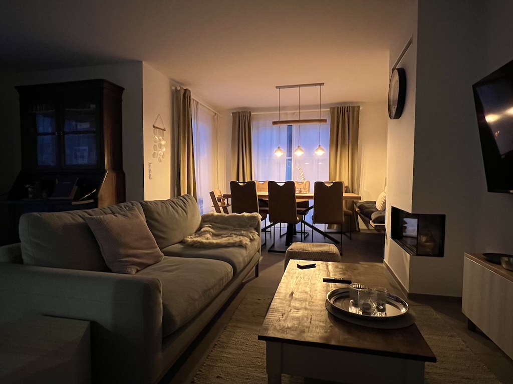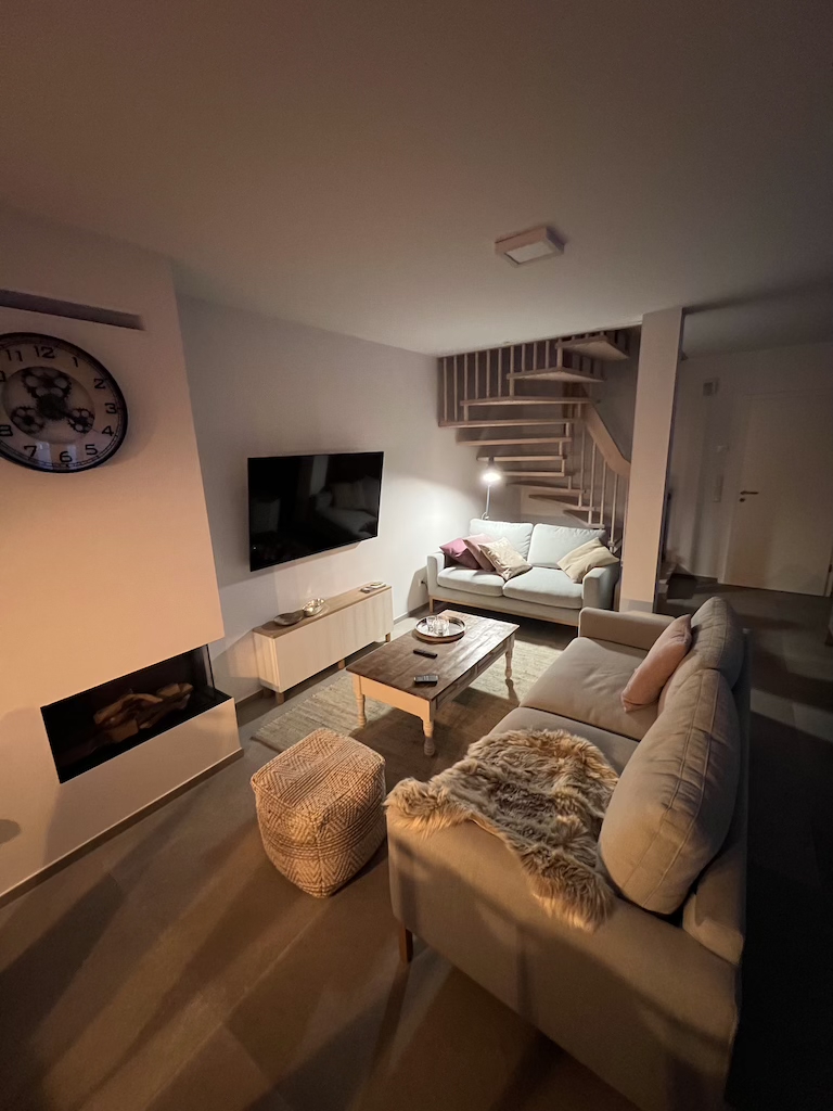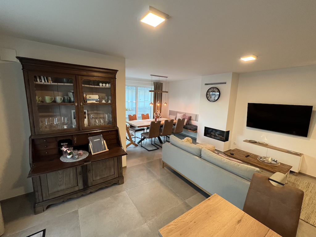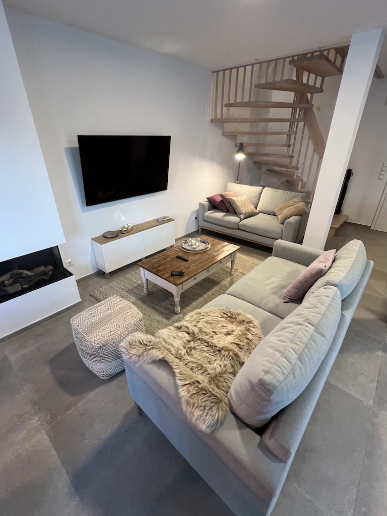 Der helle Wohnraum lädt zum gemütlichen Beisammensein ein und bietet viele Möglichkeiten – Lesen, Musik hören über die Bluetooth-Box oder ein Filmabend auf dem Smart-TV.