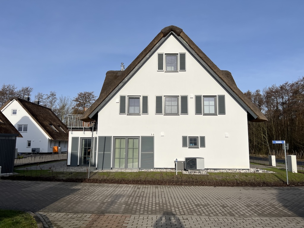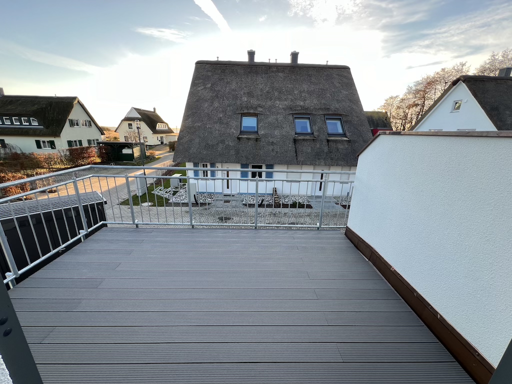 Vom Schlafzimmer im 1. Obergeschoss gelangt man auf die geräumige Dachterrasse. Von dort hat man aus dem geschützten Strandkorb einen herrlichen Blick auf Leuchtturm und Bodden.