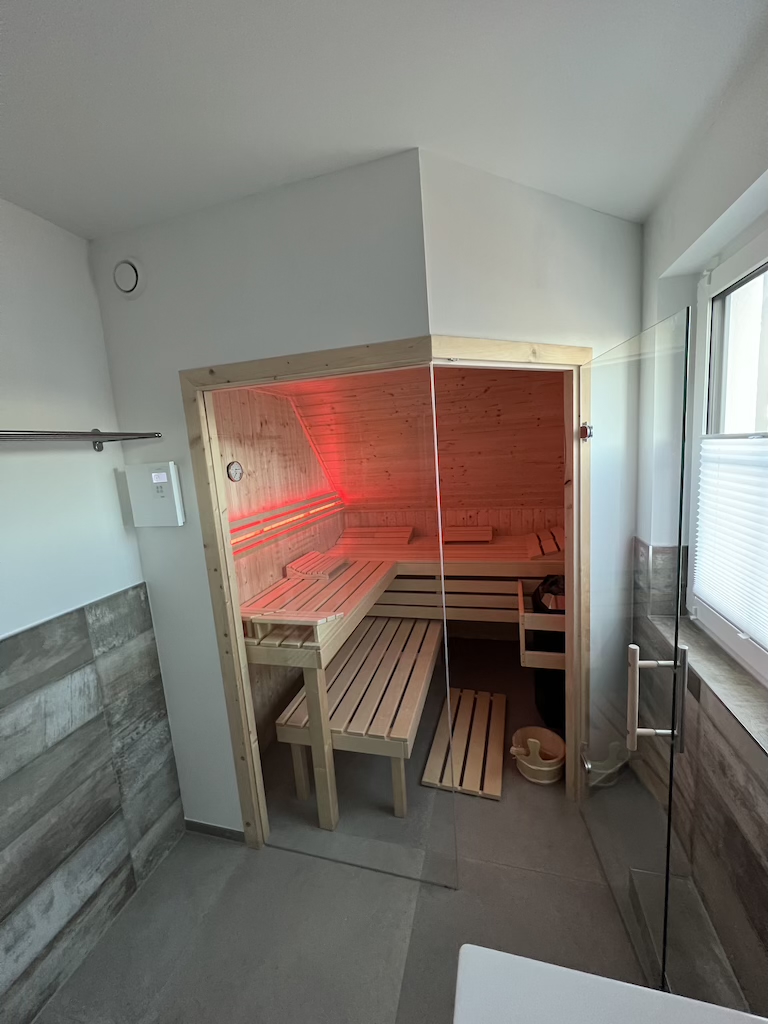 Das Bad im 1. Obergeschoss ist großzügig gestaltet und verfügt über eine finnische Sauna. Ideal zum Entspannen nach langen Strandspaziergängen im Herbst oder Winter.